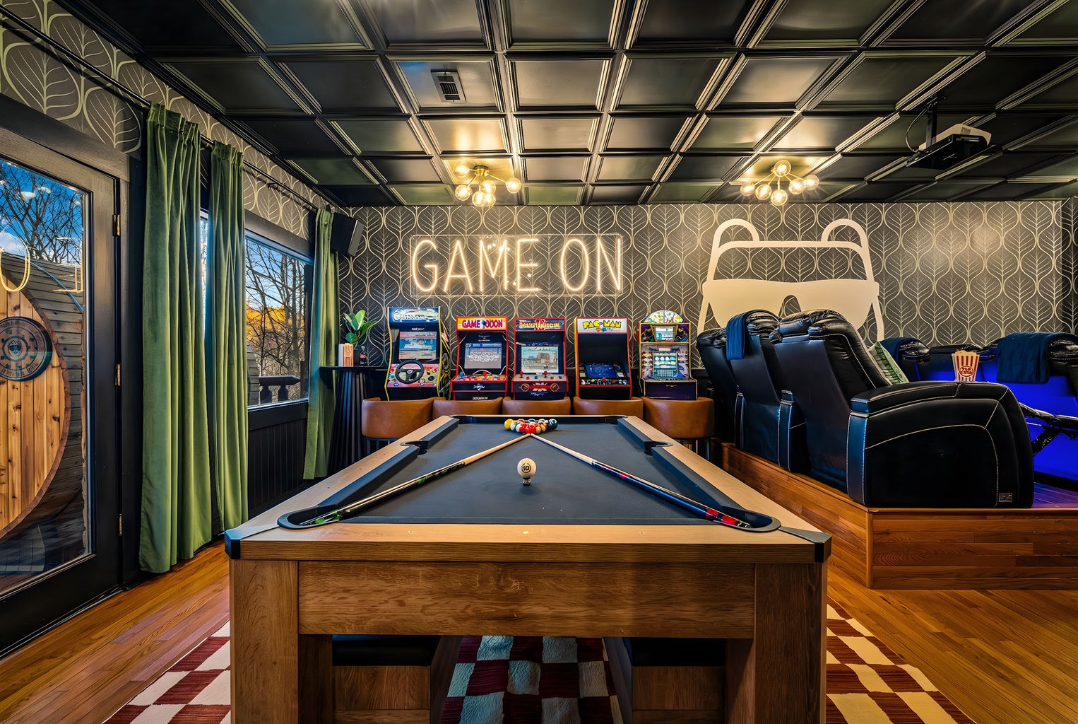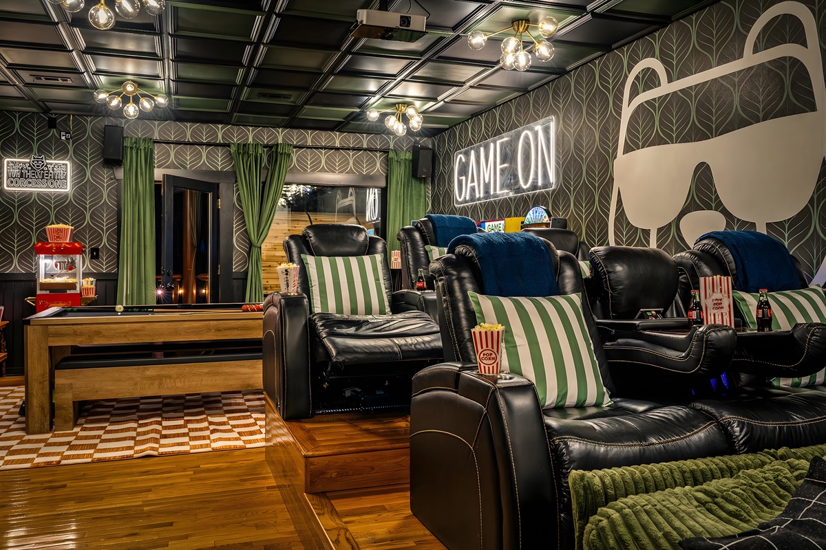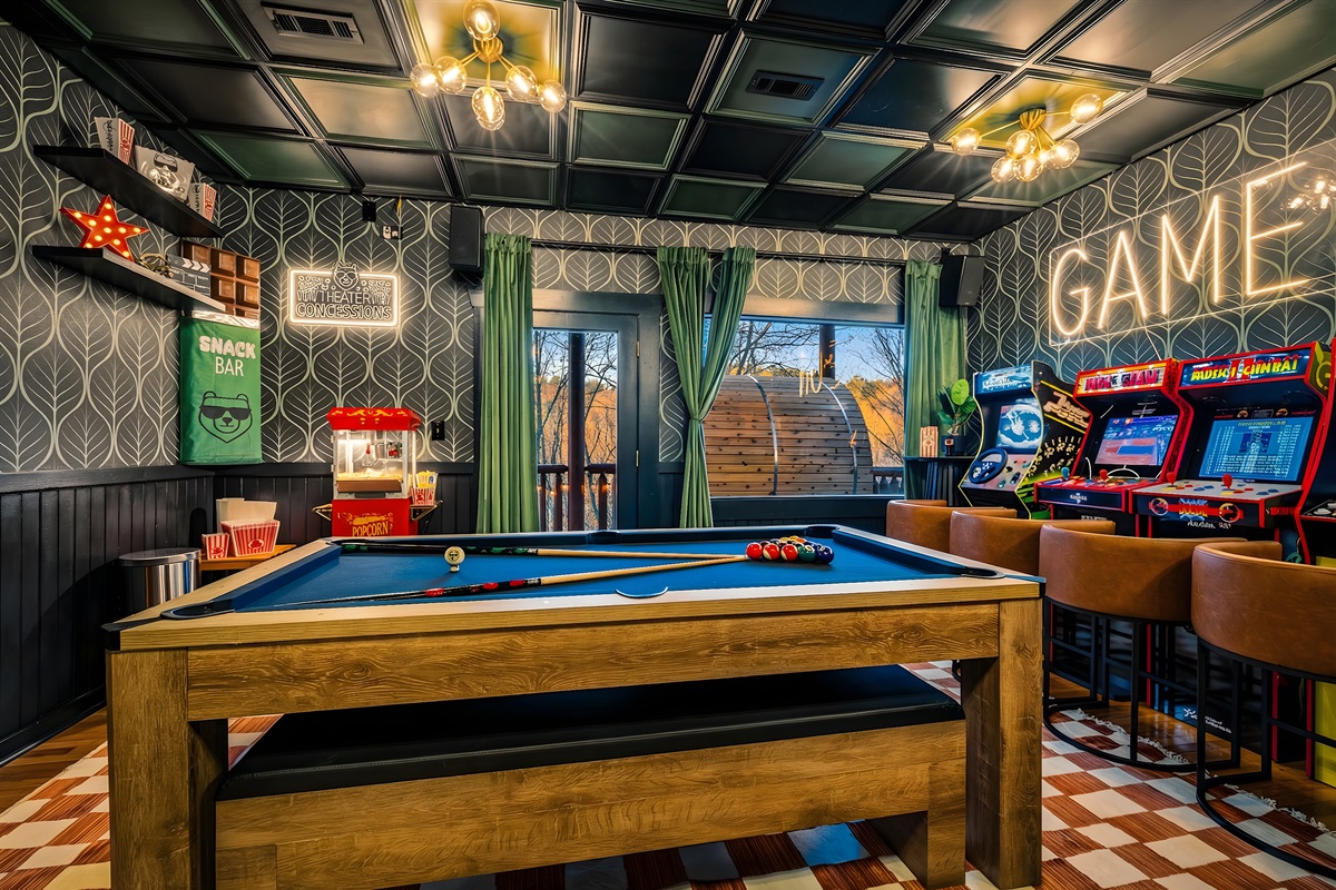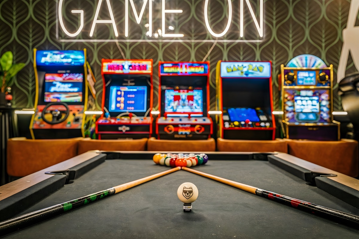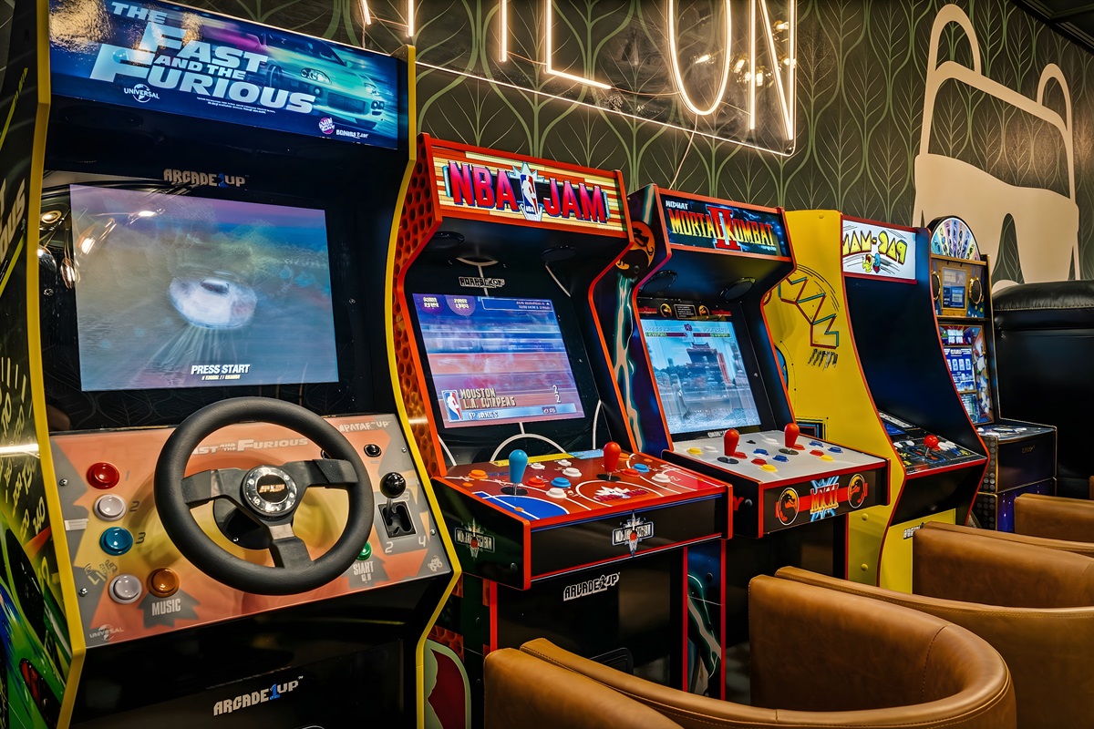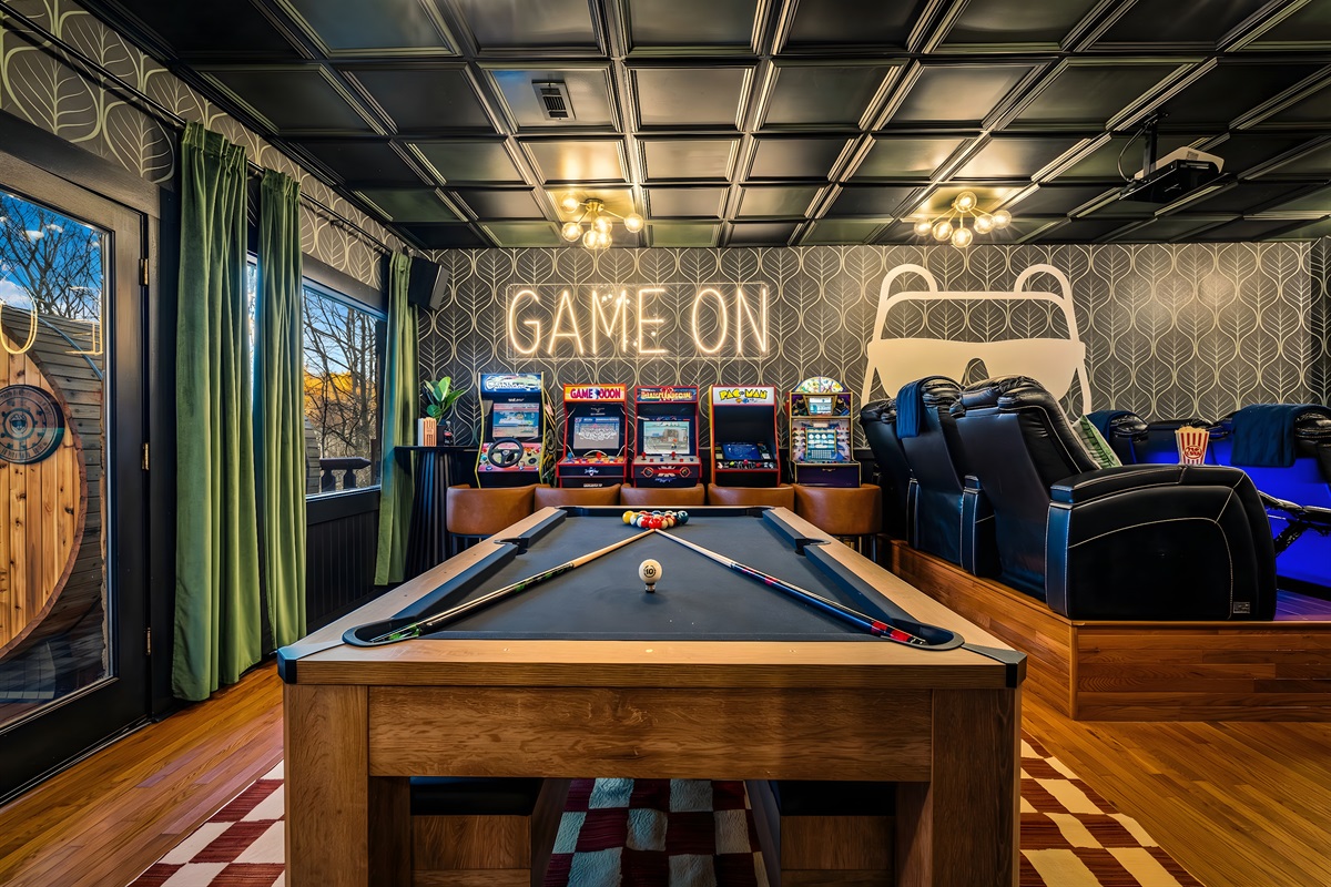 The entertainment space is designed to feel like a cozy lounge—perfect for being together without feeling overdone. Theater seating sets the tone for movie nights and big games, and once the fun starts, it’s hard to stop. Pool turns competitive, ping pong sparks a rematch, and the arcade lineup brings out everyone’s playful side. It’s the kind of setup where the kids are thrilled, and the adults are having just as much fun.