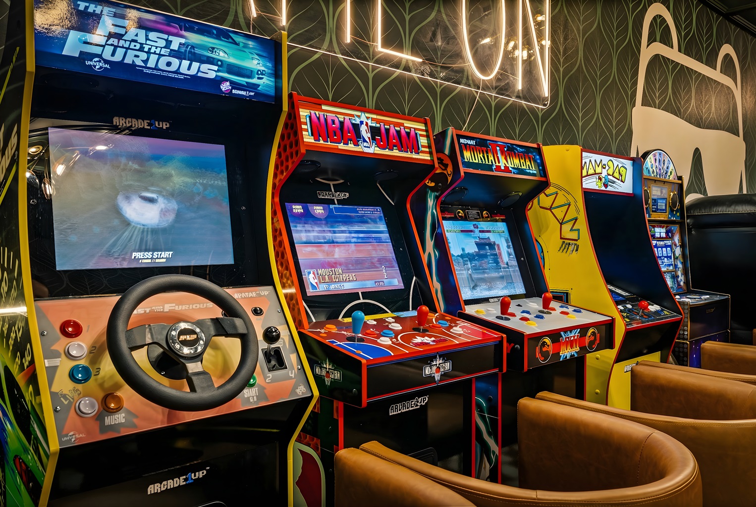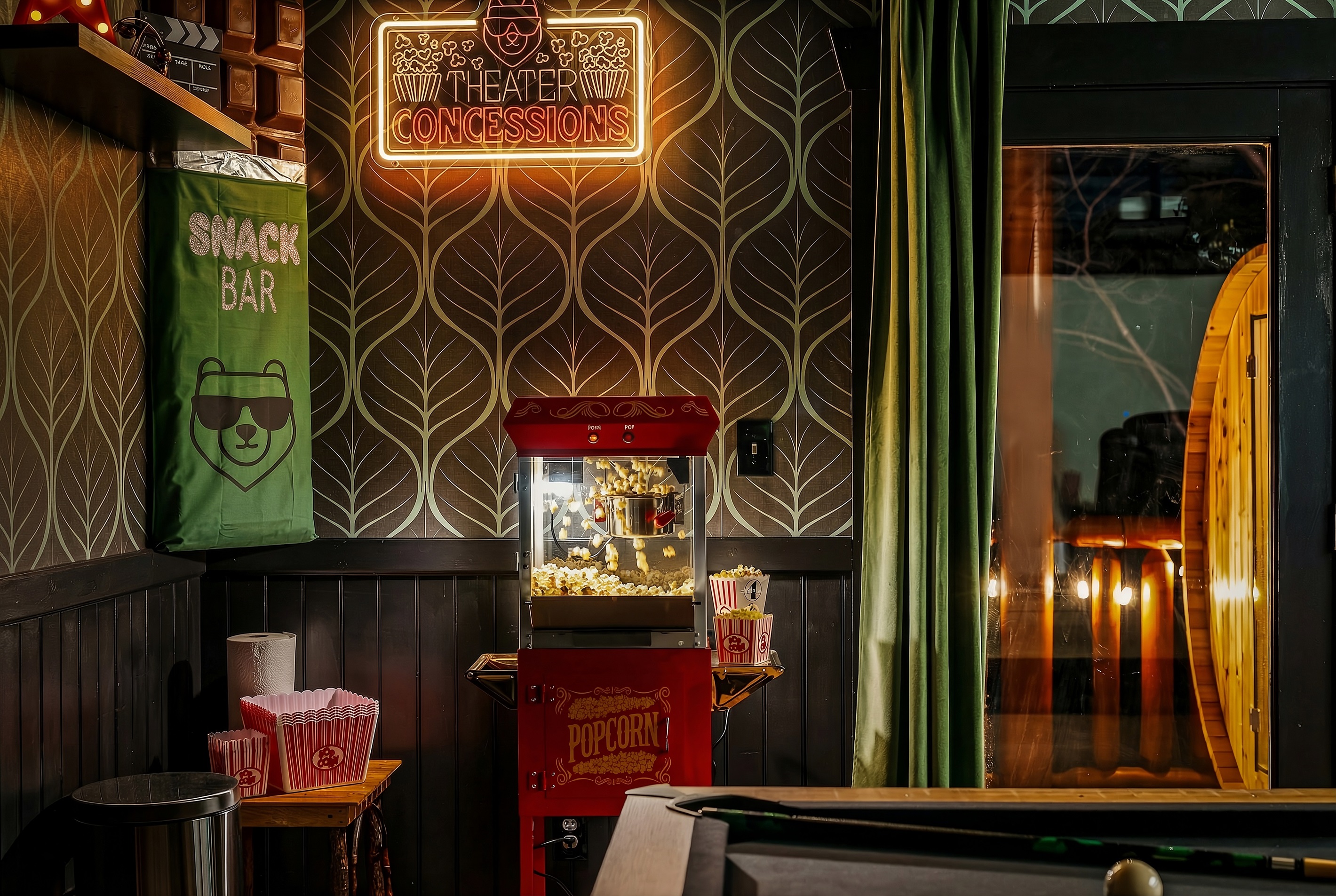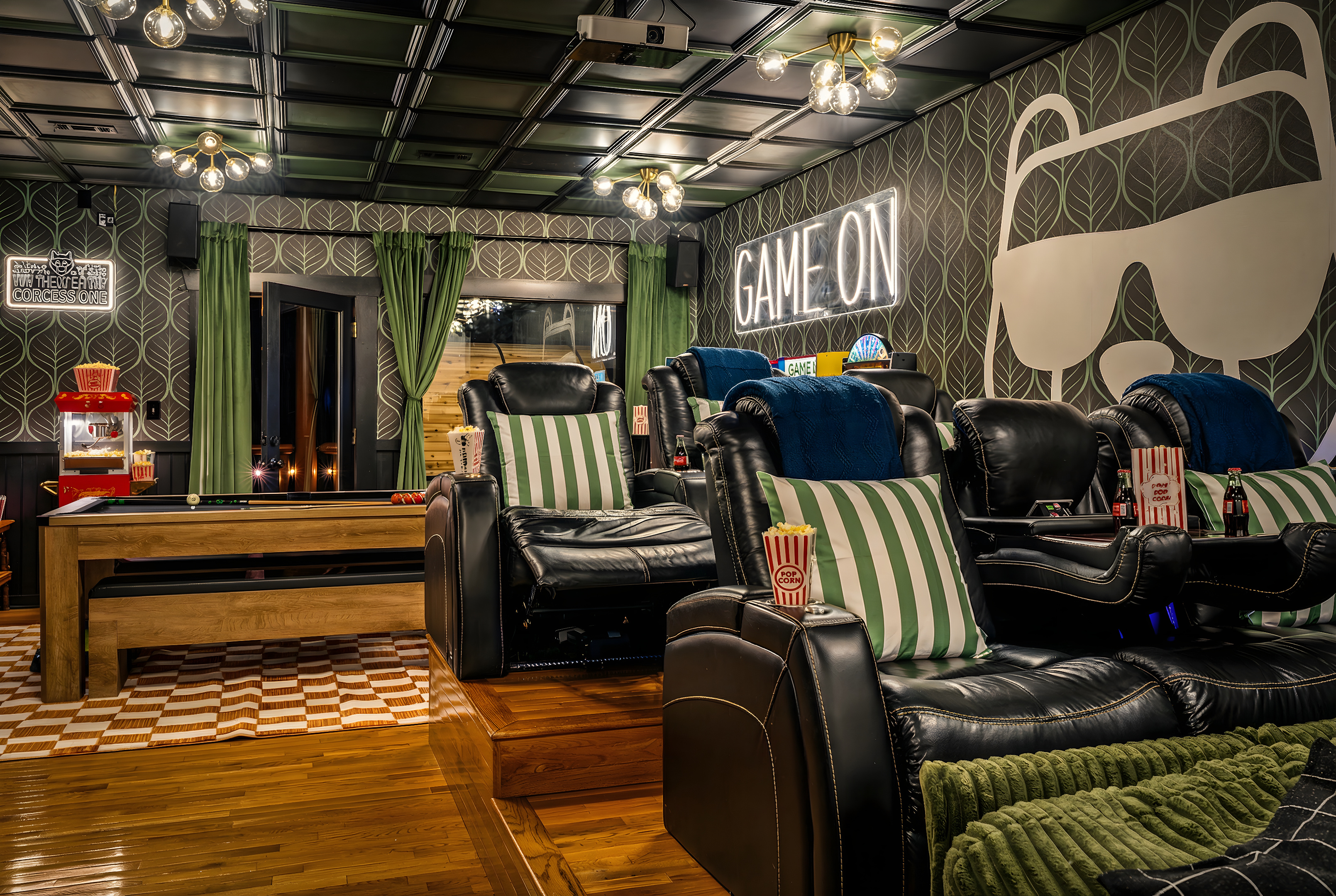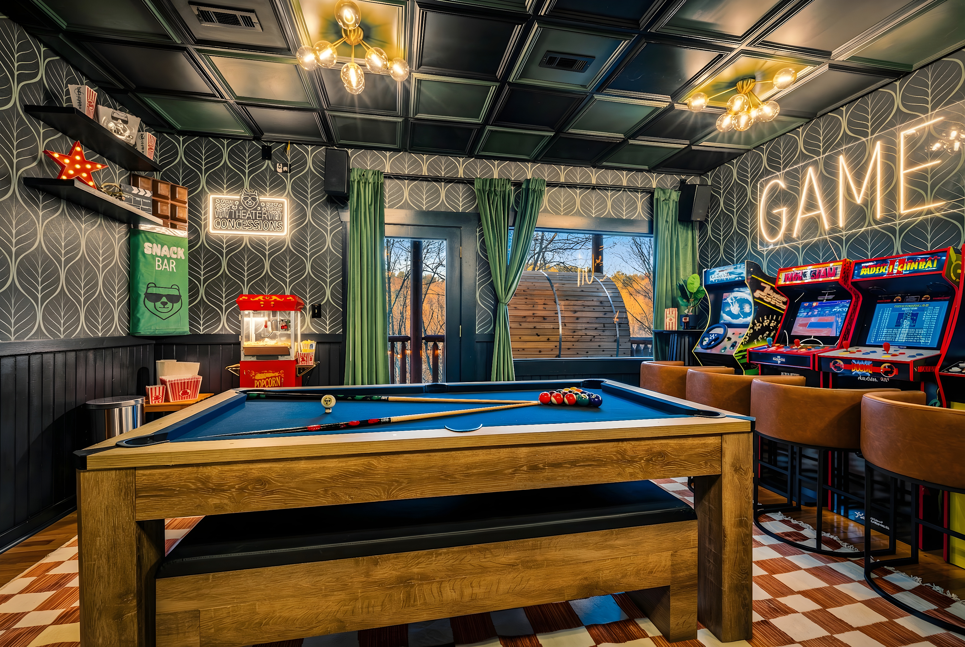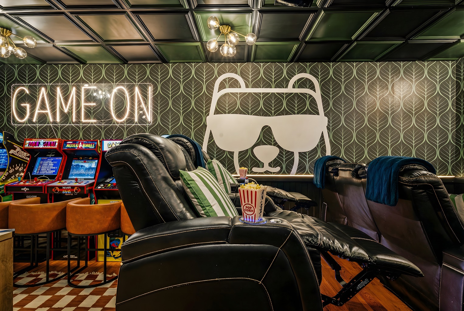 The entertainment space is designed to feel like a cozy lounge—perfect for being together without feeling overdone. Theater seating sets the tone for movie nights and big games, and once the fun starts, it’s hard to stop. Pool turns competitive, ping pong sparks a rematch, and the arcade lineup brings out everyone’s playful side. It’s the kind of setup where the kids are thrilled, and the adults are having just as much fun.