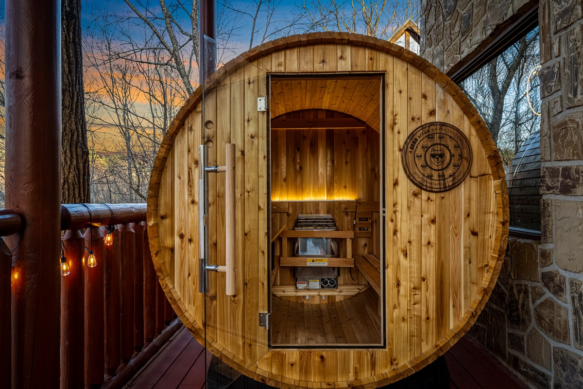 When you’re ready to slow it down, Bear Affair turns into a true unwind spot. Soak in the hot tub under the night sky, then switch gears with the Almost Heaven barrel sauna—warm, quiet, and deeply relaxing. Add string lights, fresh mountain air, and a charcoal-grilled dinner, and the whole cabin feels like a private getaway you don’t have to share with anyone.