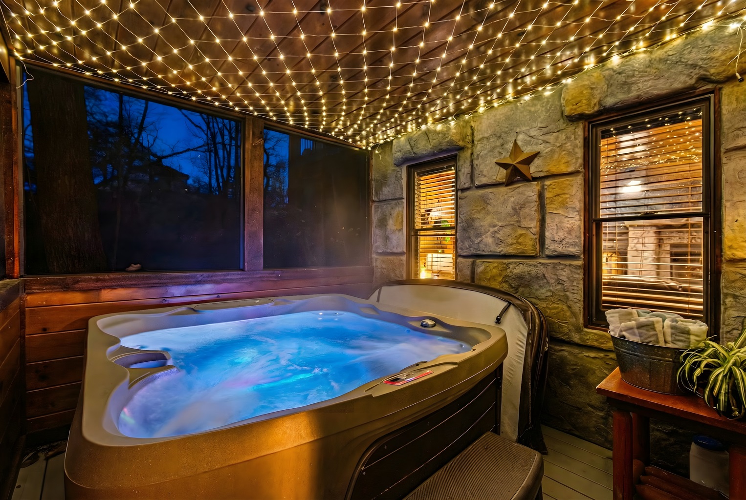 - Private hot tub on a covered deck — soak under the stars